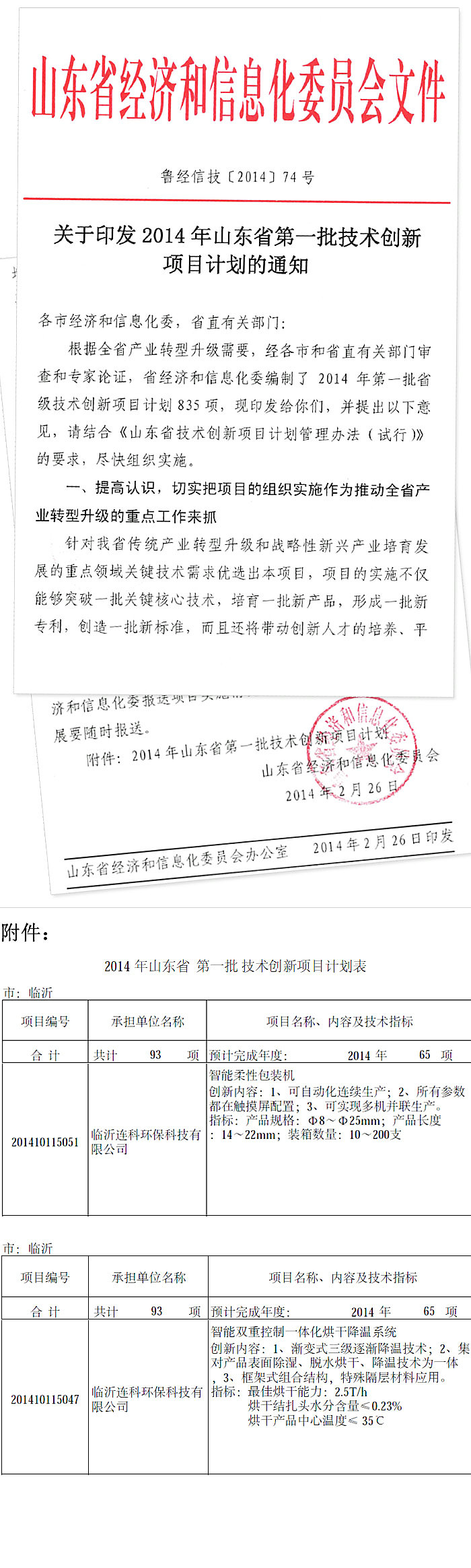 连科环保科技有限公司,取得2014年山东省第一批技术创新项目公示,分别是“智能双重控制一体化烘干降温系统”、“智能柔性包装机”。“智能双重控制一体化烘干降温系统”起止时间:2013 年1 月-2014 年12 月,“智能柔性包装机”起止时间:2013 年6 月-2015 年6 月