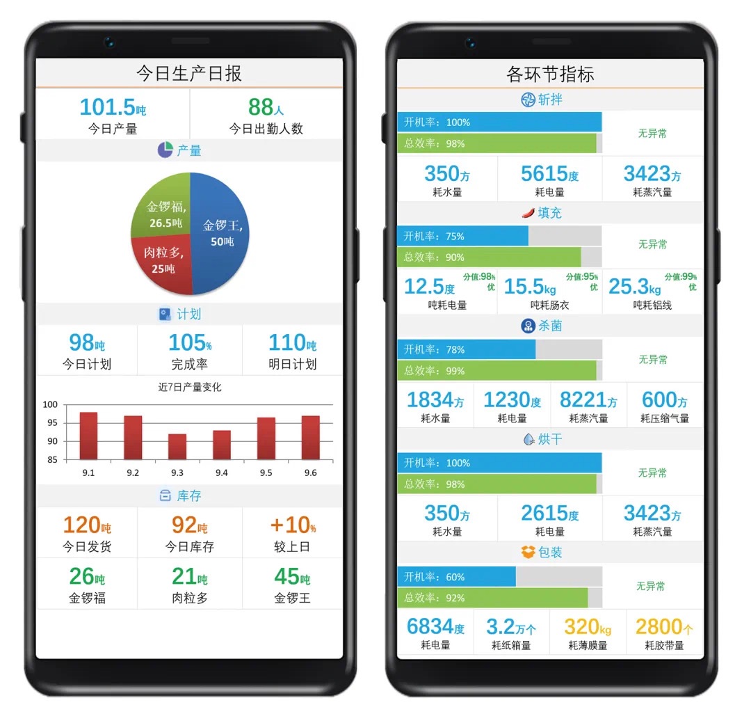系统采用工业互联网技术,将整个车间内的关键设备以及能耗节点实现数据采集、数据互联,通过平台软件集中实时监控管理,后台报表系统每日定时生成生产关键指标日报表发送给企业管理层,为企业家提供及时、准确的每日生产决策报表。 企业家无论在何时何地,每天仅需一分钟即可清晰掌握公司生产运转状况。