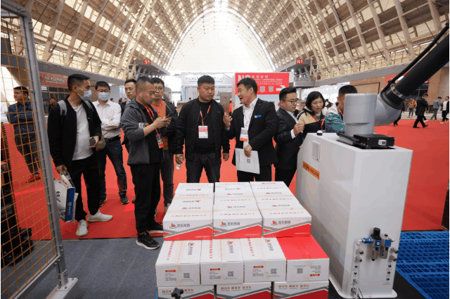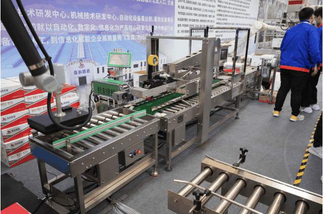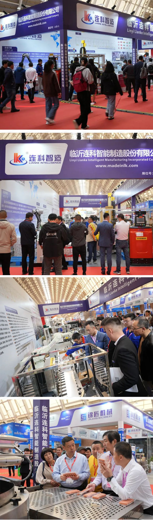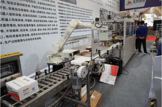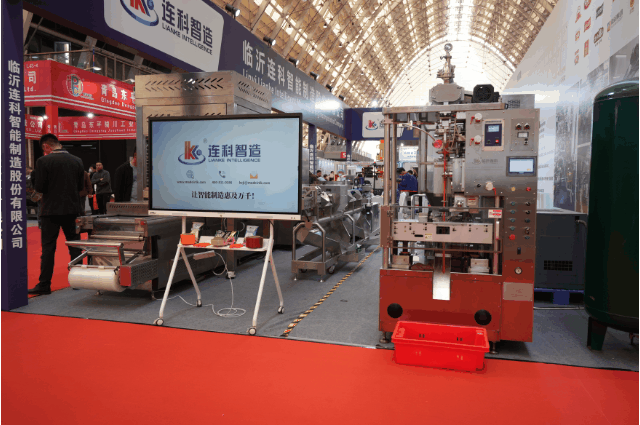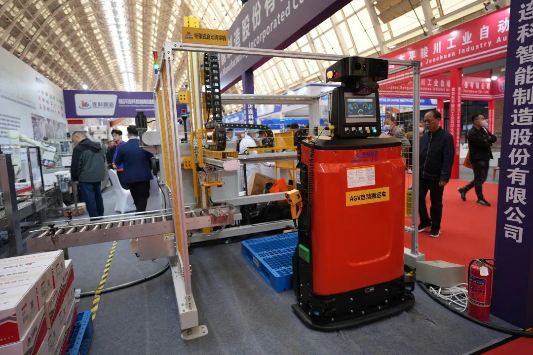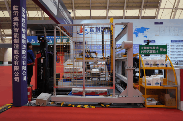 展会期间,连科智造展示了多款智能化设备和自动化解决方案,机器人投料系统、拉伸膜真空包装机、圆盘理料系统、充电式移动提升机、火腿肠填充机、伺服高速开箱机、机器人装箱系统、全自动封箱机、协作码垛工作站、桁架式自动码垛机、举升式AGV叉车和潜伏式AGV等多款智能化产品。