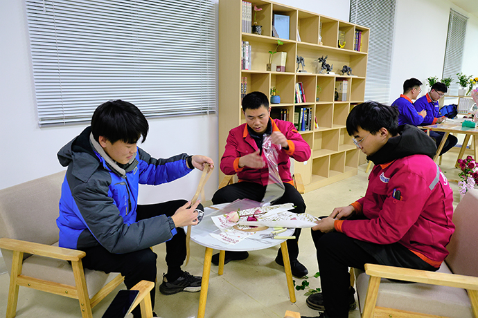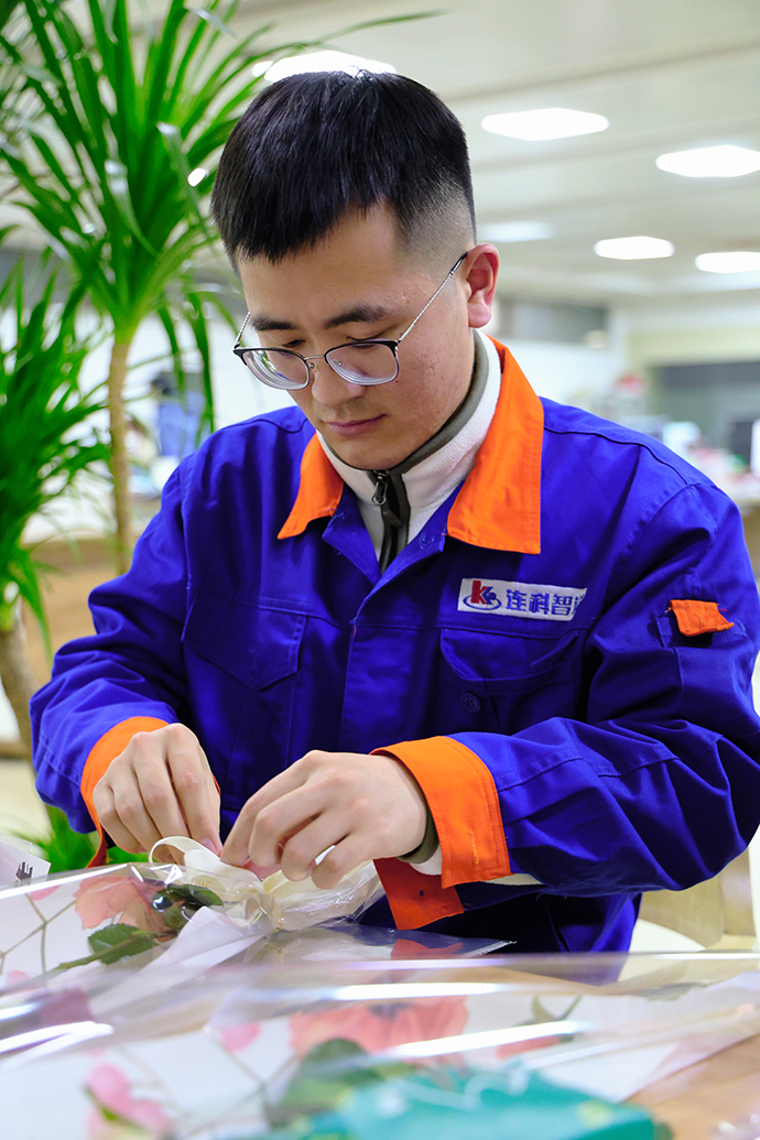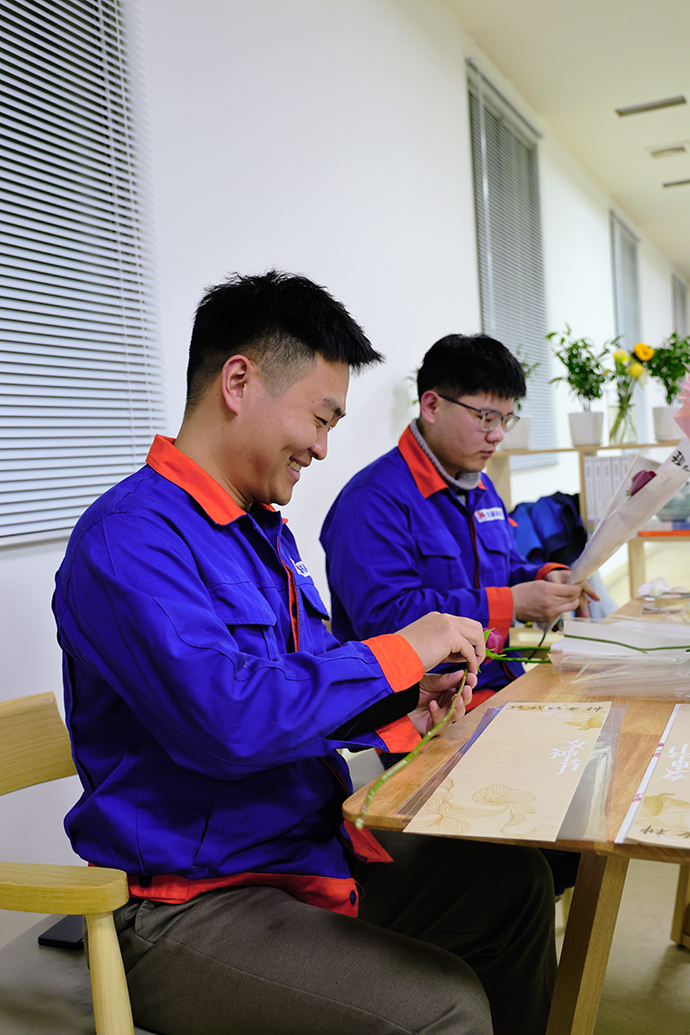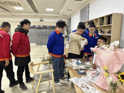 连科智造的男士们现场学习鲜花包装教学视频,亲手制作,以此向公司所有女员工们表达美好的节日祝福!