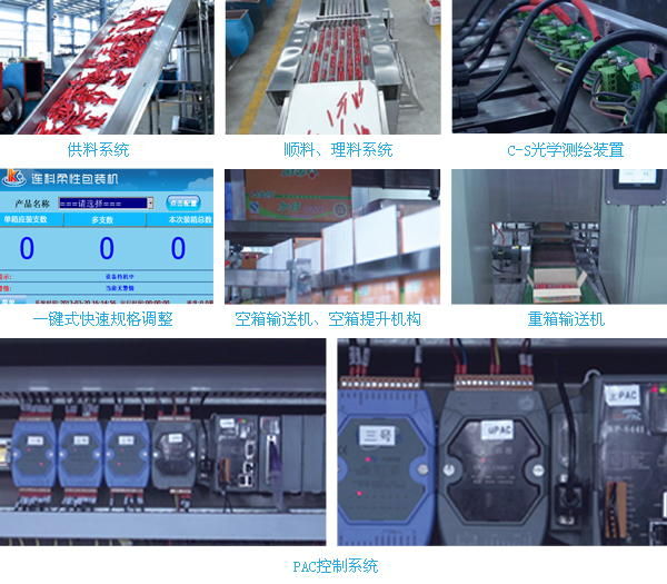 连科智能柔性包装机采用配备高速CPU的PAC控制系统和C-S光学测绘装置,以及供料系统、顺料系统、理料系统的密切配合,适用于条状物的自动计数装箱,自动化程度高,实现不间断式装箱,装箱产品的规格参数采用触摸屏一键设定,实现柔性调节。 |
