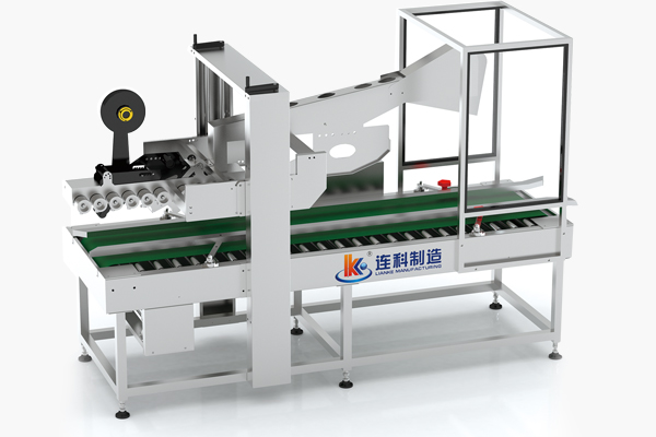 连科LK-FX01型自动折盖封箱机适用于纸箱的自动封箱工作,能够完成纸箱自动折上盖、自动封贴