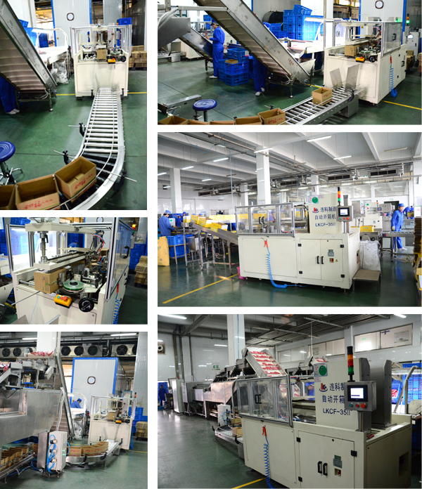 连科自动开箱机用于装箱机前纸箱的自动成型、胶带封箱底。成型纸箱板水平进入,整个成型动作连贯,成型后的纸箱通过翻转机构后开口朝上经输送线进入装箱工位或设备,自动化程度高。 |